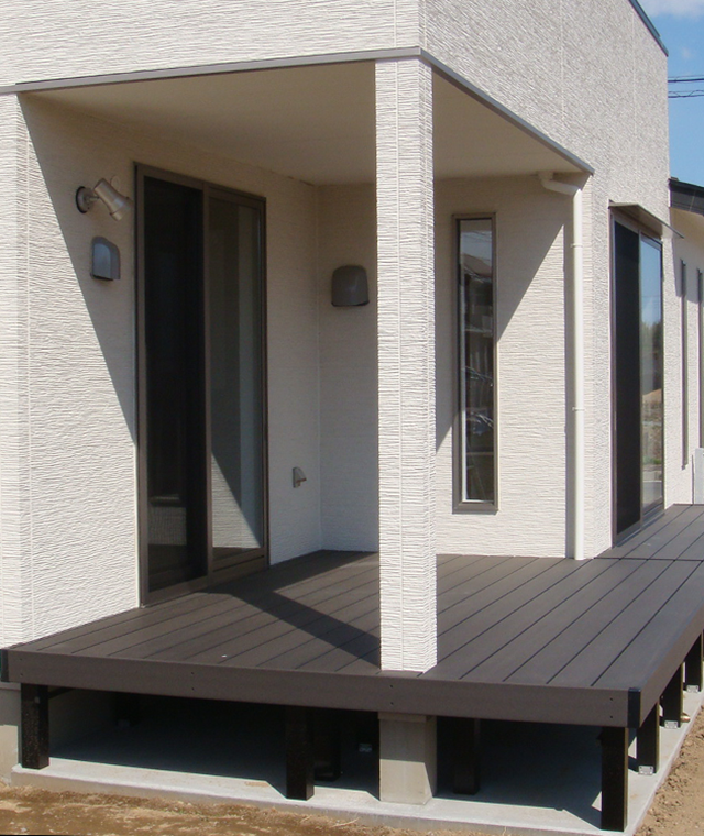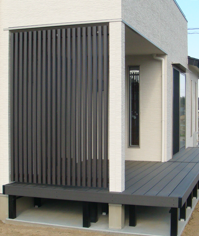 西面のデッキで日差しが眩しい為、アルミ形材木彫色格子タイプ目隠しを取付て、日差しを和らげます。