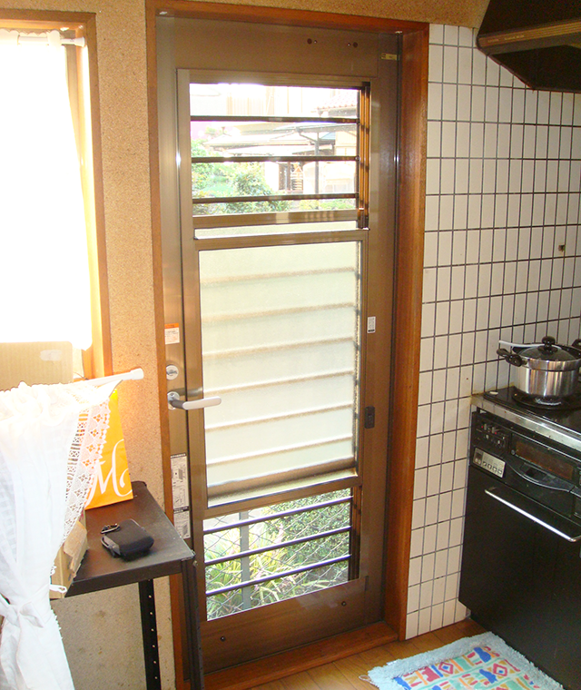 台所の空気の入れ替えにドアを開けると虫などが入るので困っている。取替用の採風勝手口ドアに交換し、上げ下げ窓内蔵、格子付網戸の為、ドアを開けずに空気の入れ替えが出来防犯性もあります。